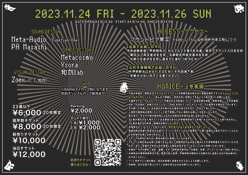 ※開催日時の延期や変更及び出演アーティストのキャンセルや変更等、ご購入者様のご都合でのキャンセルによる料金の払戻しはありません。