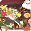 この島独特のお祝い料理として「ご赦免料理」がある。流人が赦されて本土に戻るとき、お祝いに作ったであろうと思われる料理を再現したものです。当然ながら野菜も魚も、八丈島産のものだけを使います。あしたばこんにゃく、岩のり、かみなり大根、とこぶし、ムロアジの煮付け、里芋、しのだけなど、大きなゴムの葉を皿がわりにし、島の花々をあしらって、祝いの雰囲気を盛り上げます。メインにはサクラダイの塩釜、ご飯ものは麦雑炊と、野趣あふれるヘルシーな郷土料理です。
