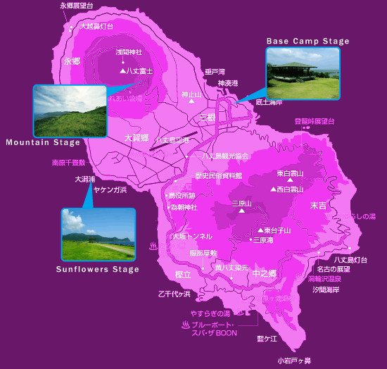 Of Todayが用意する無料巡回マイクロバス、及び自己責任でのバイク・レンタカー、タクシー、またはヒッチハイクなどを使用してください(夜に飲酒検問が実地される場合があります)。各会場間は約5km、バイクで10−15分圏内です。お急ぎの場合は各会場前に臨時タクシー乗り合い場を設けますので、皆さんお誘いあってご利用ください。島内レンタルバイク一日2500円〜。レンタカー「軽自動車」一日4000円〜「ワゴン車(8人乗り)」9000円〜です。自由に会場間を移動、そして八丈島を満喫するには自前の交通手段を持った方が良いと思われます。無料巡回マイクロバスと自前の交通手段を上手に併用してください。